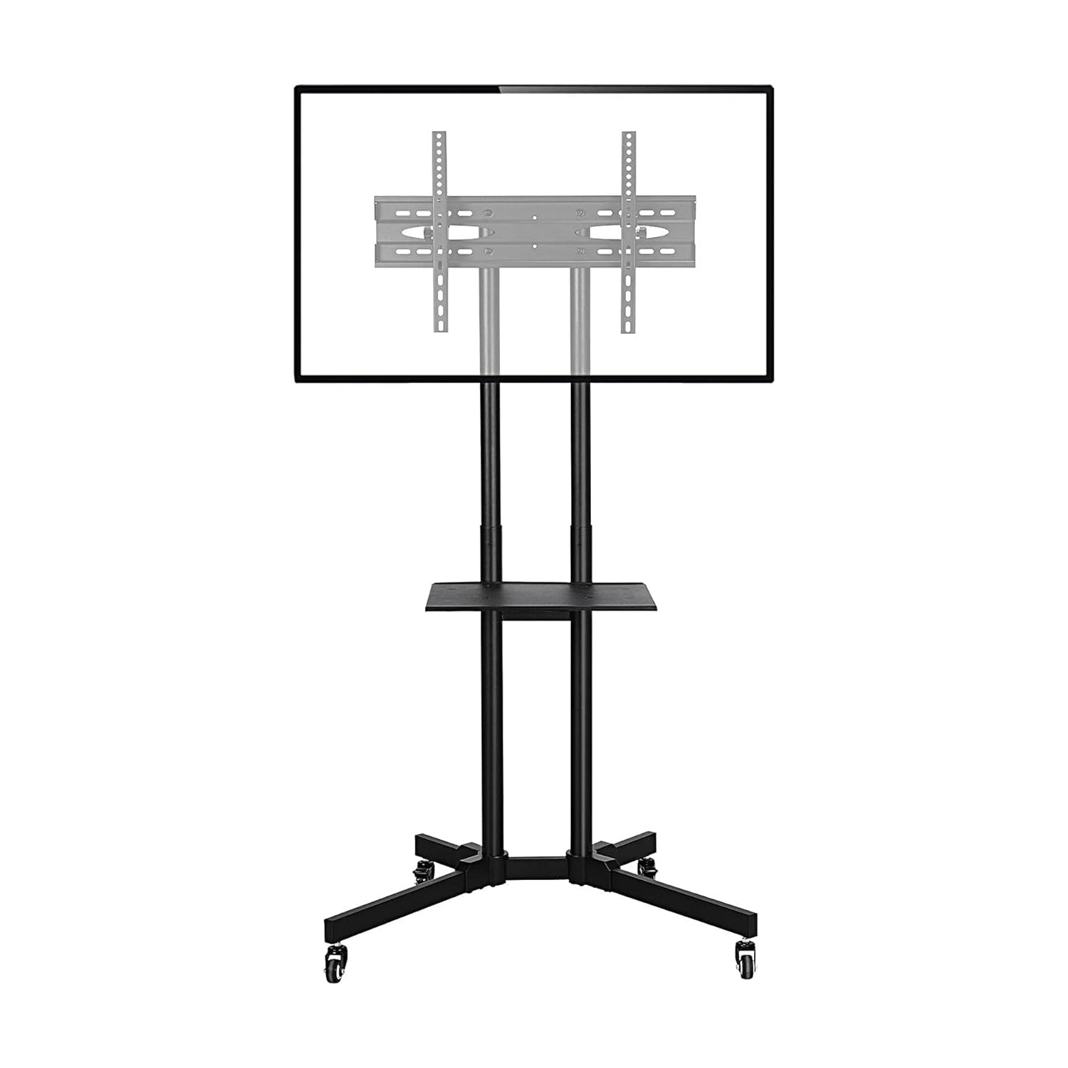 The Wheeled Mobile TV/Screen Stand with Accessory Tray is a portable adjustable mounting system designed to provide a secure support to TV's or Monitors up to 75". Built upon a heavy-duty metal frame, the stand features a mount system to attach Monitors & TV's, as well as an Accessory Tray to hold additional equipment such as cameras, lenses laptops, etc. Each stand also features 4x Caster Wheels to allow for quick and easy position adjustments in the working environment. Perfect for use as a tethering station, a station for monitoring your video productions, or as a place where you can easily access your equipment.